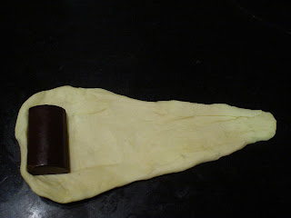 Pois bem, deu-lhe umas amassadelas e depois pô-la em forma de triângulo. A seguir foi buscar um pouco de chocolate e pôs em cima da massa...