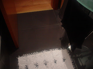 Quando pensei no chão para esta nossa casa-de-banho de serviço precisava que ele fosse cinzento, uma vez que as paredes são prateadas ( sim...isso mesmo leram bem: são prateadas...hehehe), e na altura (há nove anos atrás) o que gostamos mais foi deste que estão a ver ... placas enormes