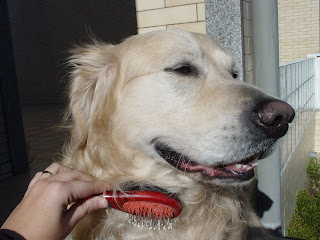 Não é que adoooooooore ser penteado (fico dividido: em certa parte gosto porque parece que recebo uma massagem mas às vezes levo alguns puxõezinhos que não gosto nada... e depois diz a Té: "desculpa lá Goldito mas pa ficares bonito e eu não ter o teu rico pelinho a passear-se pela casinha, tem que ser...")